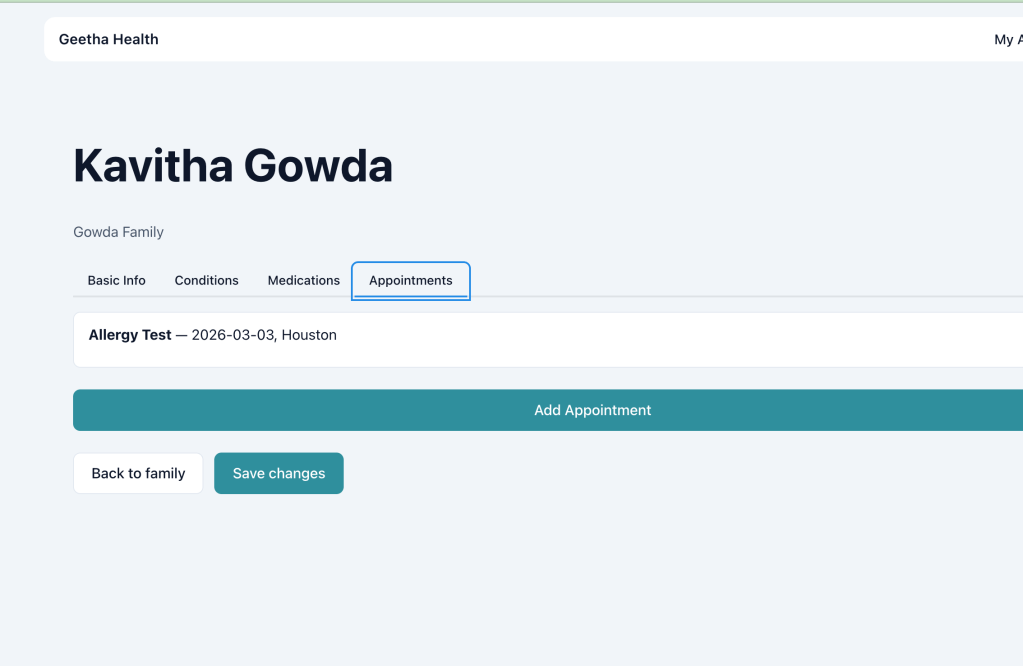 Right now it’s super simple, you make a family and add family member to your family. Then you can add basics of their healthcare to their profile. Next I’ll be adding text and email reminder to this.